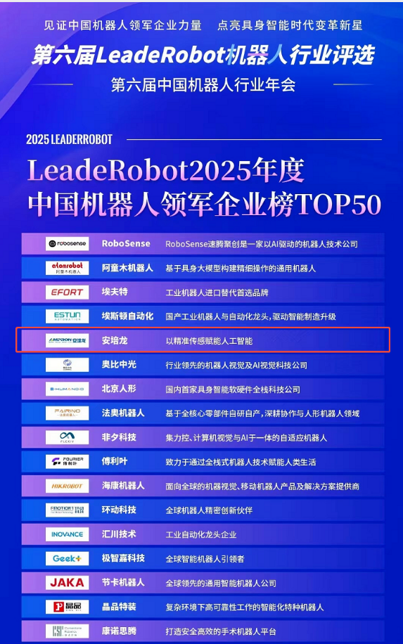 在本次機器人行業年會中,安培龍基于在力傳感領域的系統布局與持續創新,從眾多企業中脫穎而出,成功榮登《LeadeRobot2025年度中國機器人領軍企業榜TOP50》。此次登榜,標志著安培龍作為機器人核心零部件領域的關鍵力量,已獲得行業權威認可。該榜單匯聚了中國機器人各細分賽道的中堅企業,涵蓋工業、醫療及人形機器人本體、關鍵零部件等多個方向,深刻體現了上榜企業在機器人應用領域的技術突破、市場應用與產業協同等方面的體系化競爭力。安培龍的入選,正是其在高精度力傳感技術上的持續創新與產業協同方面的有力證明。