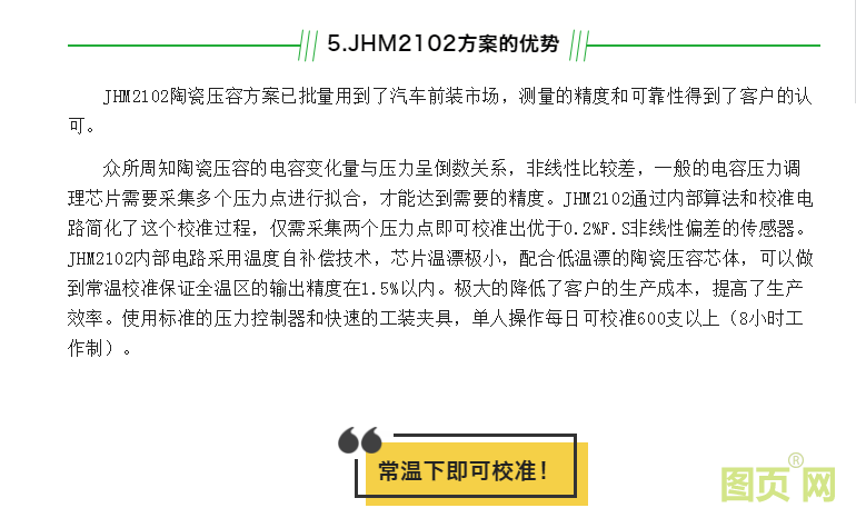陶瓷壓容技術具有量程范圍寬、溫度特性好、可過載能力強、長期穩(wěn)定性好等優(yōu)勢。廣泛應用于冷媒、機油、剎車、燃油等壓力測量。陶瓷壓容芯體有很好的溫度特性,例如2MPa的芯體每100℃溫漂優(yōu)于0.5%F.s。搭配久好電子的JHM2102僅需要常溫兩點校準,就可以做到-40~125℃溫區(qū)內1.5%F.S以內的精度。