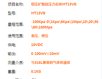 產品描述 :HTxxV系列隔離膜壓力芯體是一種采用恒壓供電的芯體。具有精度高、多種結構、穩定性好等特點,可應用在與316L不銹鋼相兼容的各種液體、氣體壓力的測量和控制。