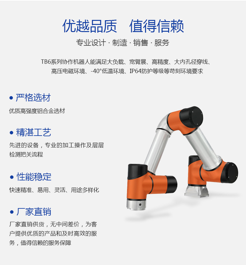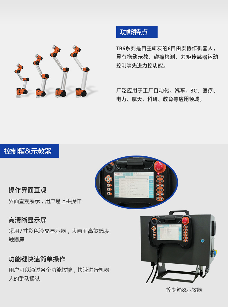 深圳泰科智能TB6系列協(xié)作機(jī)器人是泰科智能自主研發(fā)的6軸輕型協(xié)作機(jī)器人,具有拖動(dòng)示教、安全防碰撞等功能,可以直接與人協(xié)同工作。采用自主設(shè)計(jì)研發(fā)RJSII系列關(guān)節(jié)模組,既輕便靈活、運(yùn)行平滑柔順,同時(shí)滿足負(fù)荷的需求。防護(hù)等級(jí)高,可適用于更多苛刻的工作環(huán)境,既有強(qiáng)大的通用性、 協(xié)作性與開放性,廣泛應(yīng)用于物流裝配、流水線生產(chǎn)、上下料、AGV、3C電子、科研、醫(yī)療等行業(yè)領(lǐng)域。安裝簡(jiǎn)單(安裝方式任意角度)及用途多樣化,提升產(chǎn)品品質(zhì)和生產(chǎn)效率,并更好的節(jié)約人工成本。
