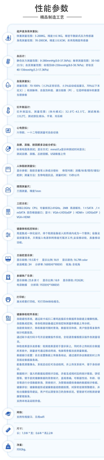 首先,上正華瑞健康體檢一體機能夠快速、準確地完成多項醫學檢查,包括身高、體重、血壓、心率、血氧飽和度、血糖、血脂等。這些檢查通常是日常查體工作中必不可少的項目,而健康體檢一體機能夠在短時間內自動化地完成這些檢查,大大提高了查體工作的效率。