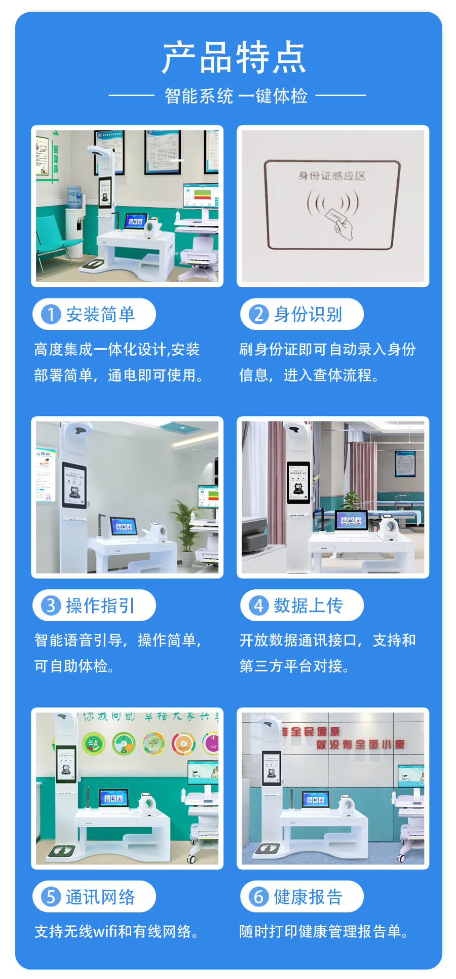1、早期發現潛在疾病:上正華瑞臺式健康一體機集成了多種檢測功能,如血壓、血糖、心電圖等,能夠全面、快速地檢測居民的基本健康狀況。通過定期使用這種設備進行體檢,可以及早發現潛在的健康問題或疾病征兆,為居民提供及時的治療或干預,防止病情惡化。